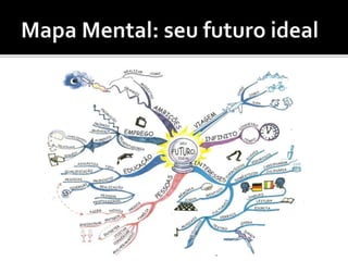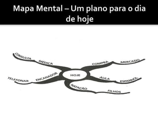 Este documento descreve os benefícios dos mapas mentais para organizar o pensamento de forma criativa e eficiente, destacando que eles podem ajudar a ser mais criativo, ganhar tempo e organizar ideias, além de melhorar o desempenho em exames. O texto também fornece 7 passos básicos para criar um mapa mental, enfatizando o uso de imagens, cores, ramos curvos e palavras-chave.