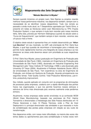 O documento apresenta o método "Marchiori & Miyake" para mapeamento rápido dos sete desperdícios em empresas. O método utiliza checklists e pontuação para identificar as áreas com maiores perdas, gerando gráficos que direcionam os esforços de melhoria. A aplicação do método auxilia empresas no direcionamento inicial dos apontamentos de perdas exigidos pelo programa WCM.