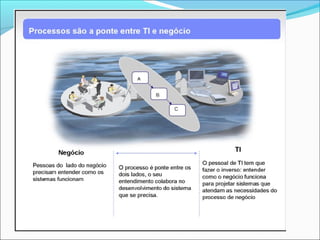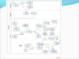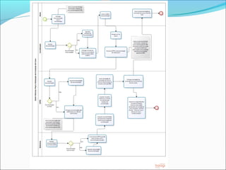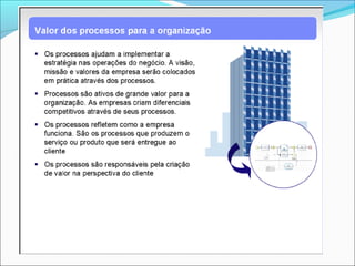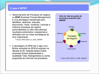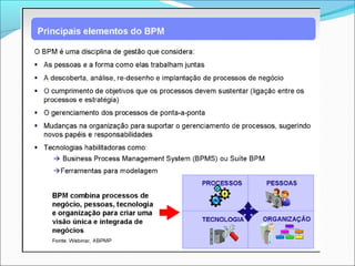 O documento discute o mapeamento e modelagem de processos de negócios. Ele define o que é um processo, mapeamento de processos e a notação BPMN. Também explica como mapear processos usando 10 passos e quais são os principais elementos do BPMN como pools, lanes, fluxos e atividades.