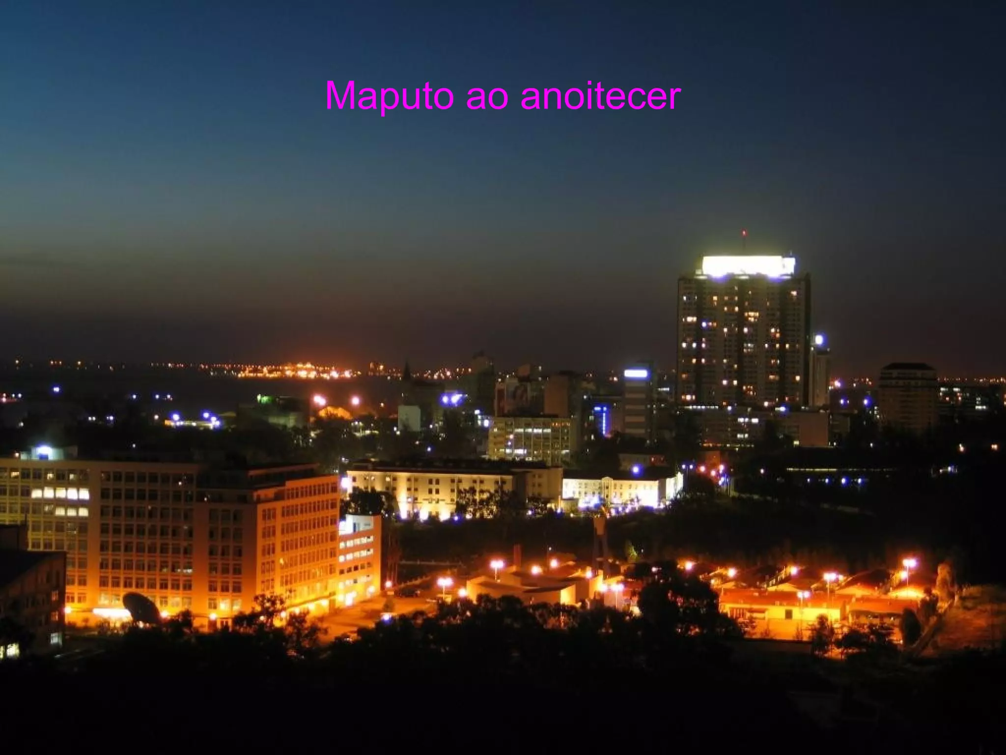 Este documento contém uma série de fotografias de lugares e edifícios históricos da cidade de Maputo, antigamente conhecida como Lourenço Marques, incluindo locais como o Clube Naval, a Catedral, o Teatro Gil Vicente, a Praça de Touros, a Baía de Maputo, a antiga Estação Ferroviária, a Casa de Ferro, o Aeroporto e a Igreja da Namacha. As fotos fornecem uma visão do património arquitetónico e dos principais pontos
