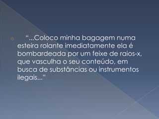 O documento discute o uso crescente de sistemas de vigilância e monitoramento em aeroportos, cidades e na internet. Essas tecnologias permitem escanear bagagens, gravar cidadãos em público e coletar dados sobre hábitos e preferências de usuários on-line. Alguns argumentam que isso pode ameaçar a privacidade, enquanto outros acreditam que ajuda a manter a segurança.