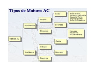 O documento descreve máquinas elétricas, especificamente motores de indução. Define máquinas elétricas e seus tipos principais, motores de indução e seu princípio de funcionamento, métodos de partida e controle de velocidade destes motores. Apresenta também influências da rede elétrica e da carga mecânica em sua operação.
