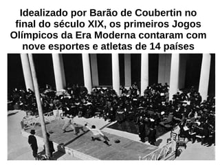 Idealizado por Pierre de Coubertin no final do século XIX, os primeiros Jogos Olímpicos da Era Moderna ocorreram em Atenas em 1896 com nove esportes e atletas de 14 países. Após 116 anos de evolução, os Jogos se expandiram globalmente com mais esportes, gêneros e participantes de todo o mundo.