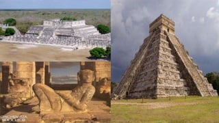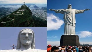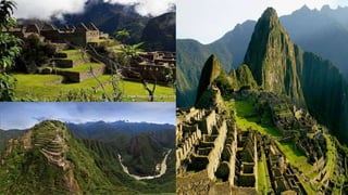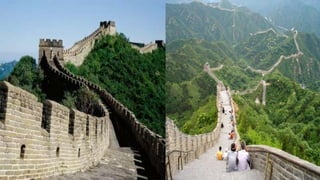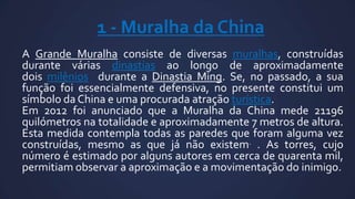 O documento descreve 7 maravilhas do mundo moderno, incluindo a Muralha da China, Petra, Cristo Redentor, Machu Picchu, Chichén Itzá, Coliseu de Roma e Taj Mahal. Cada local é brevemente descrito com detalhes sobre sua história, construção e importância cultural.