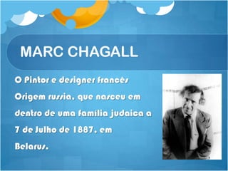 Marc Chagall foi um pintor e designer francês nascido na Rússia em 1887. Seu trabalho é repleto de imagens fantasiosas e poéticas inspiradas em suas memórias da comunidade judaica russa e episódios de sua vida. Ele combinou influências do expressionismo russo e cubismo francês em seu estilo único de uso da cor e forma.