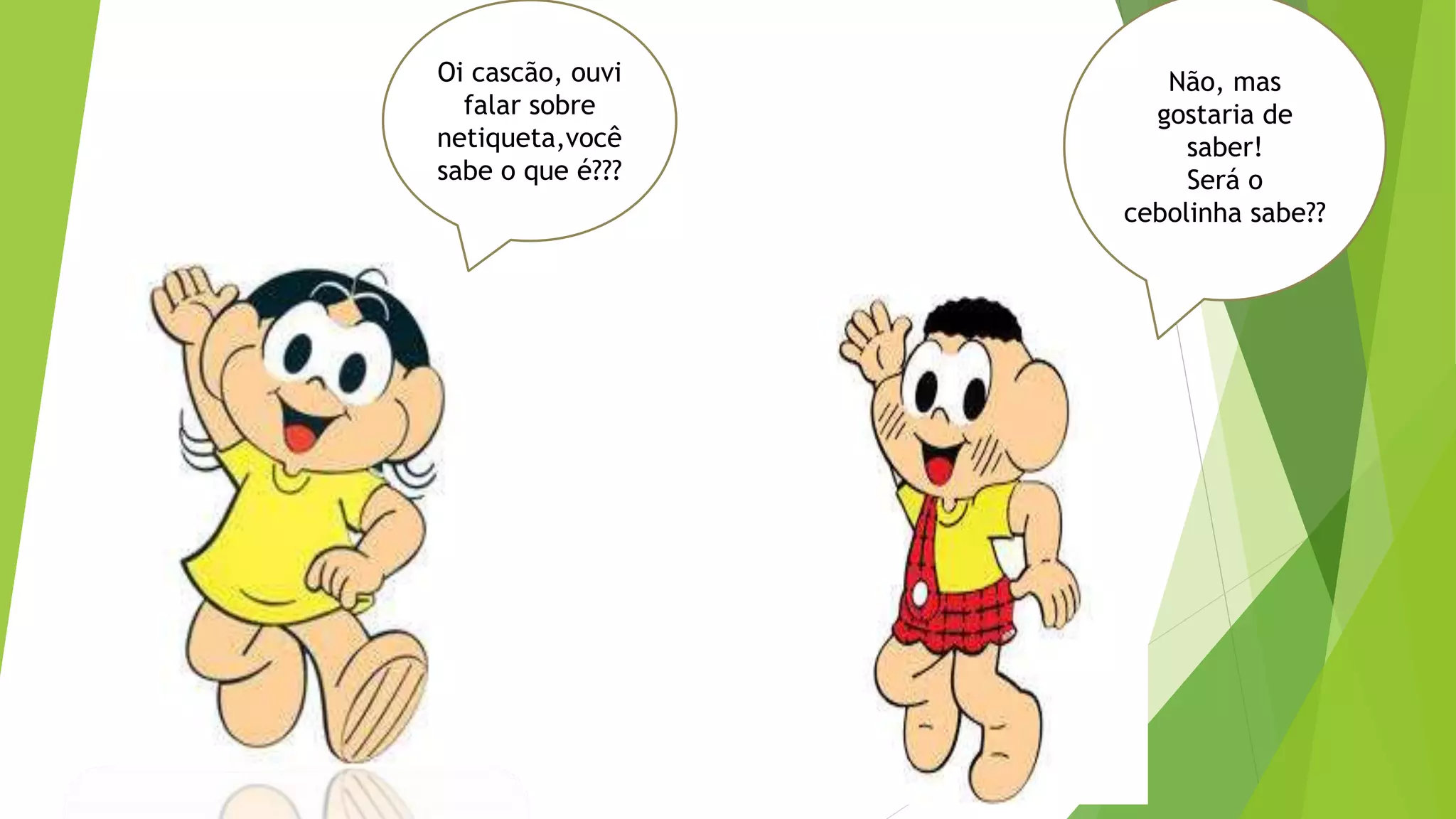 Cascão, Cebolinha e Flanjinha discutem o que é netiqueta e vão procurar o Flanjinha para explicar. Flanjinha explica que netiqueta é como se comportar respeitosamente na internet, respeitando o espaço dos outros.