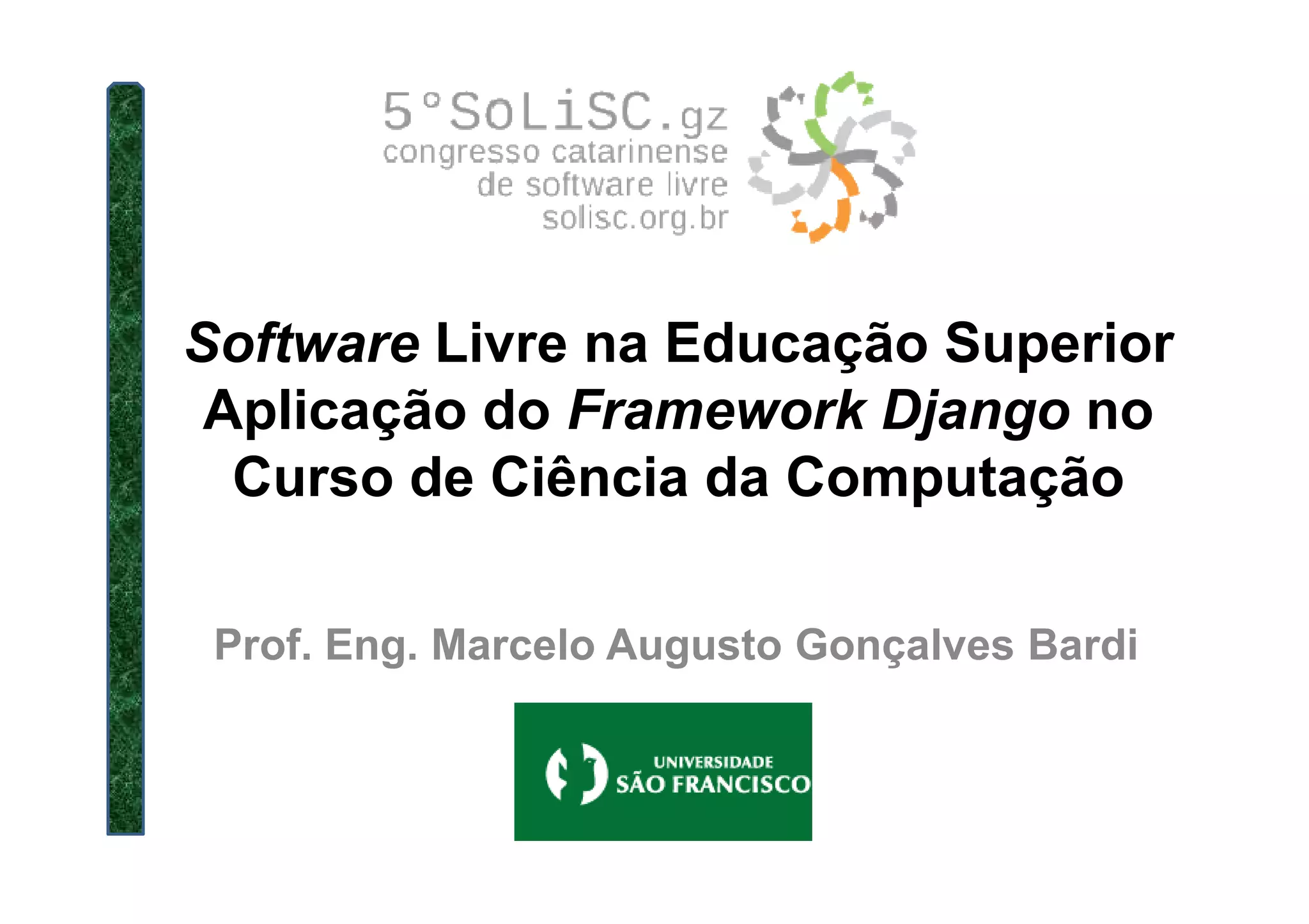 1. O documento discute a aplicação do framework Django no curso de Ciência da Computação para desenvolver projetos web usando software livre.