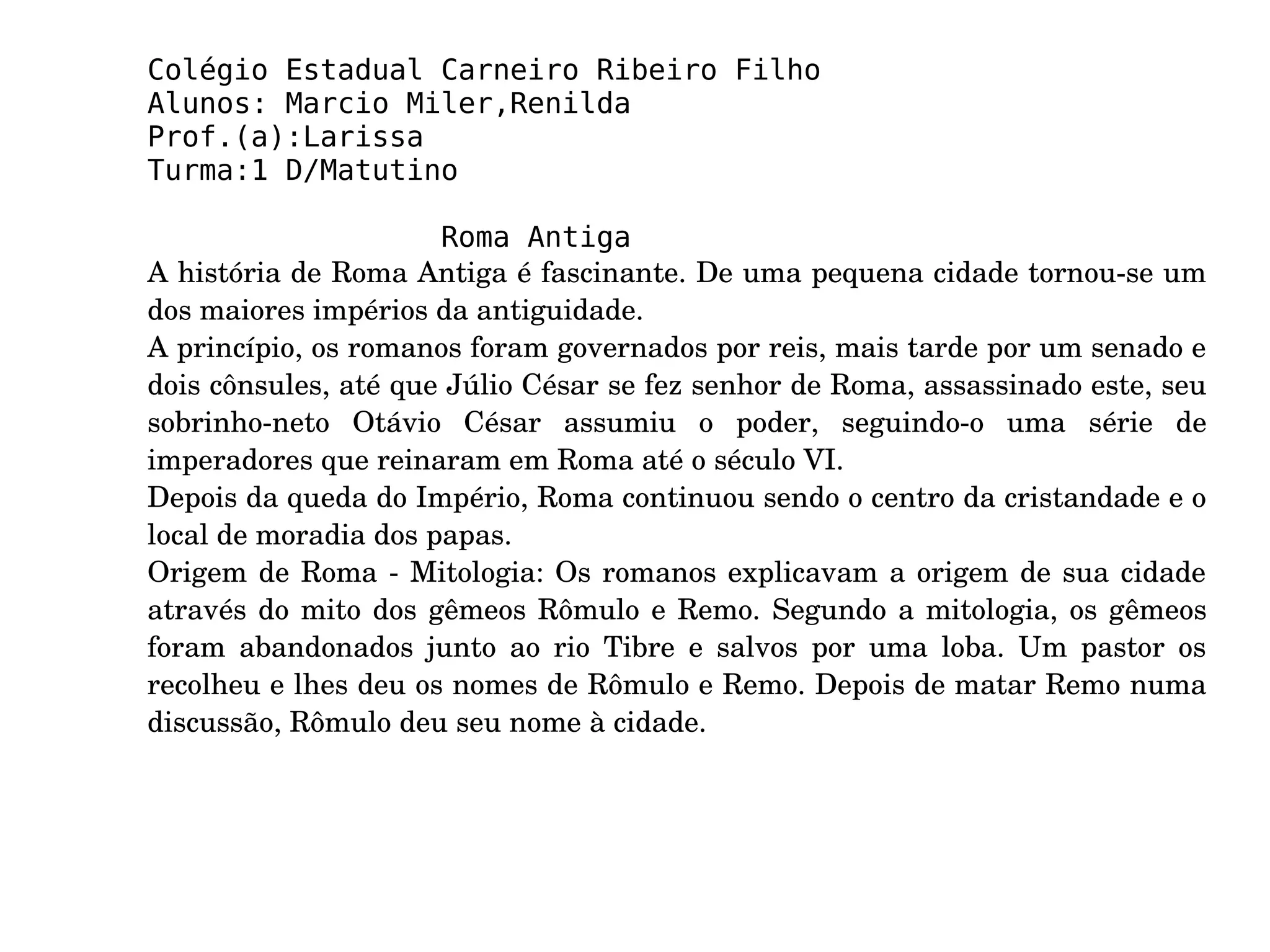 Roma começou como uma pequena cidade e se tornou um grande império governado por reis, um senado e cônsules. Eventualmente Júlio César assumiu o poder e seu sobrinho-neto Otávio César estabeleceu o Império Romano, que durou séculos. A civilização romana deixou uma grande herança cultural, incluindo legislação, língua e arquitetura.