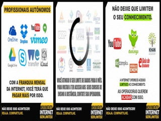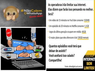 O documento descreve o histórico e desenvolvimento do Marco Civil da Internet no Brasil desde 2007, incluindo suas principais mudanças entre 2014-2016. Também discute a aplicação atual do Marco Civil em relação a bloqueios do WhatsApp e a regulamentação da internet em outros países como China e EUA.
