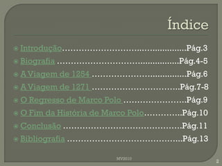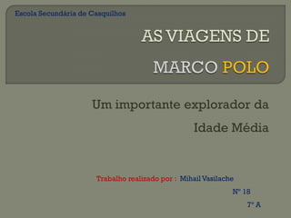 Este documento descreve a vida e as viagens do explorador Marco Polo na Idade Média. Marco Polo nasceu em Veneza em 1254 e viajou para a China com seu pai e tio em 1271, onde permaneceu por 16 anos servindo ao imperador Kublai Khan. Ele retornou a Veneza em 1295 e documentou suas viagens, fornecendo aos europeus as primeiras informações detalhadas sobre a Ásia Oriental.