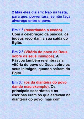 1. Jesus come a Páscoa com seus discípulos, revelando que um deles o trairá. Apesar da tristeza, Jesus institui a Santa Ceia para comemorar seu sacrifício.
