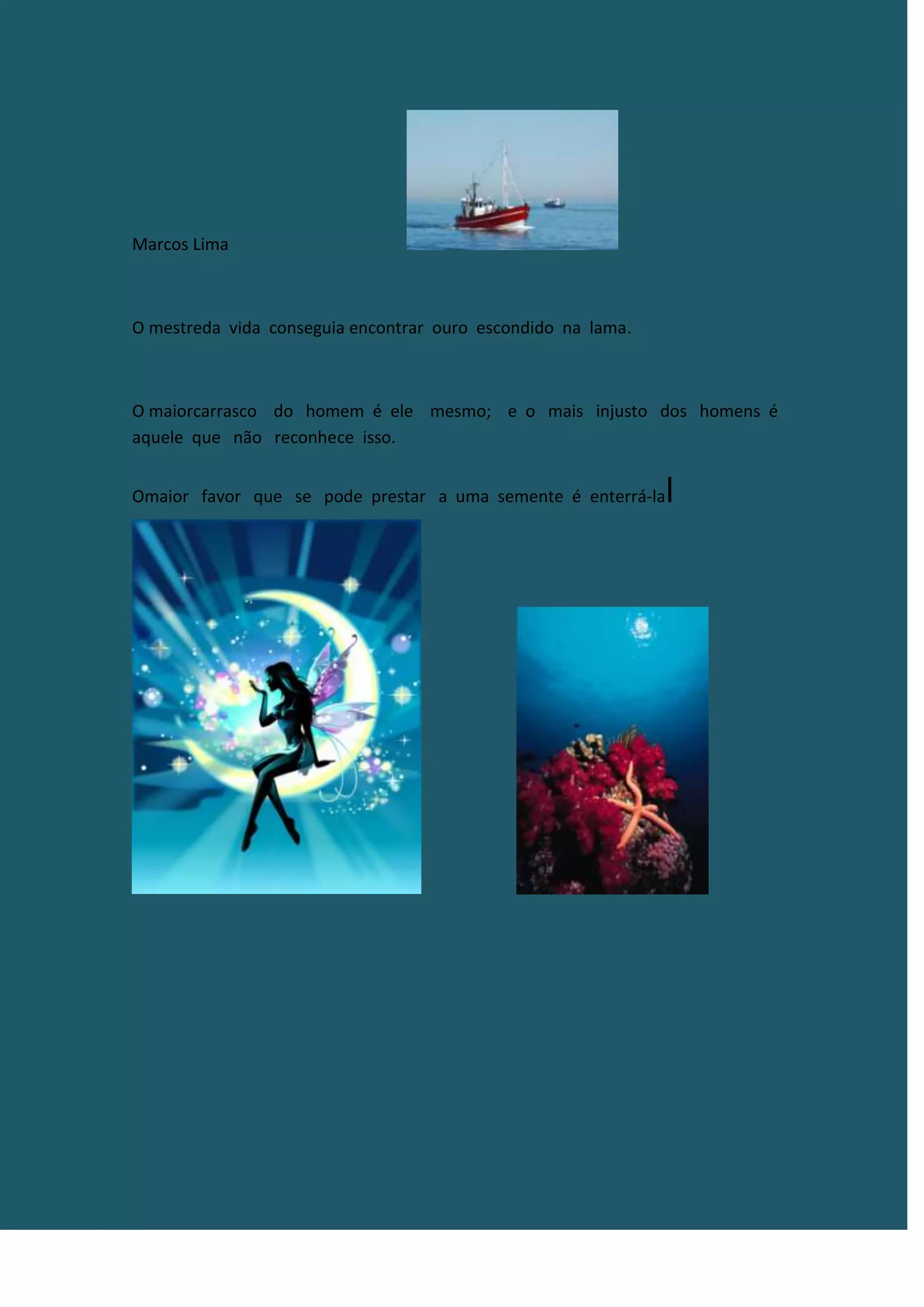 Marcos Lima era um mestre que tinha a habilidade de encontrar ouro escondido. O maior inimigo de um homem é ele mesmo, quando não reconhece que suas próprias ações podem ser injustas. Enterrar uma semente é o maior favor que se pode prestar a ela, para que possa germinar e crescer.