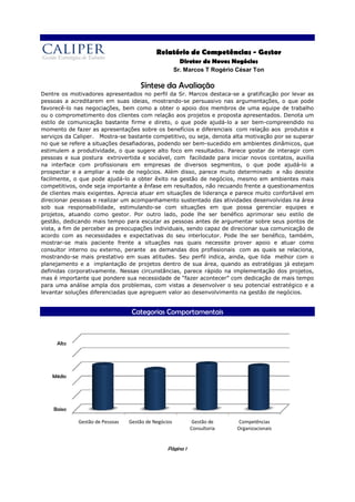 Este relatório fornece um resumo do perfil comportamental e profissional do Sr. Marcos T. Rogério César Ton para o cargo de consultor de vendas. O relatório indica que ele tem características como segurança para tomar decisões, auto-estima e gosto por desafios que o beneficiam nesta função. Recomenda que ele foque em desenvolver habilidades de escuta ativa e cooperação para obter melhores resultados.