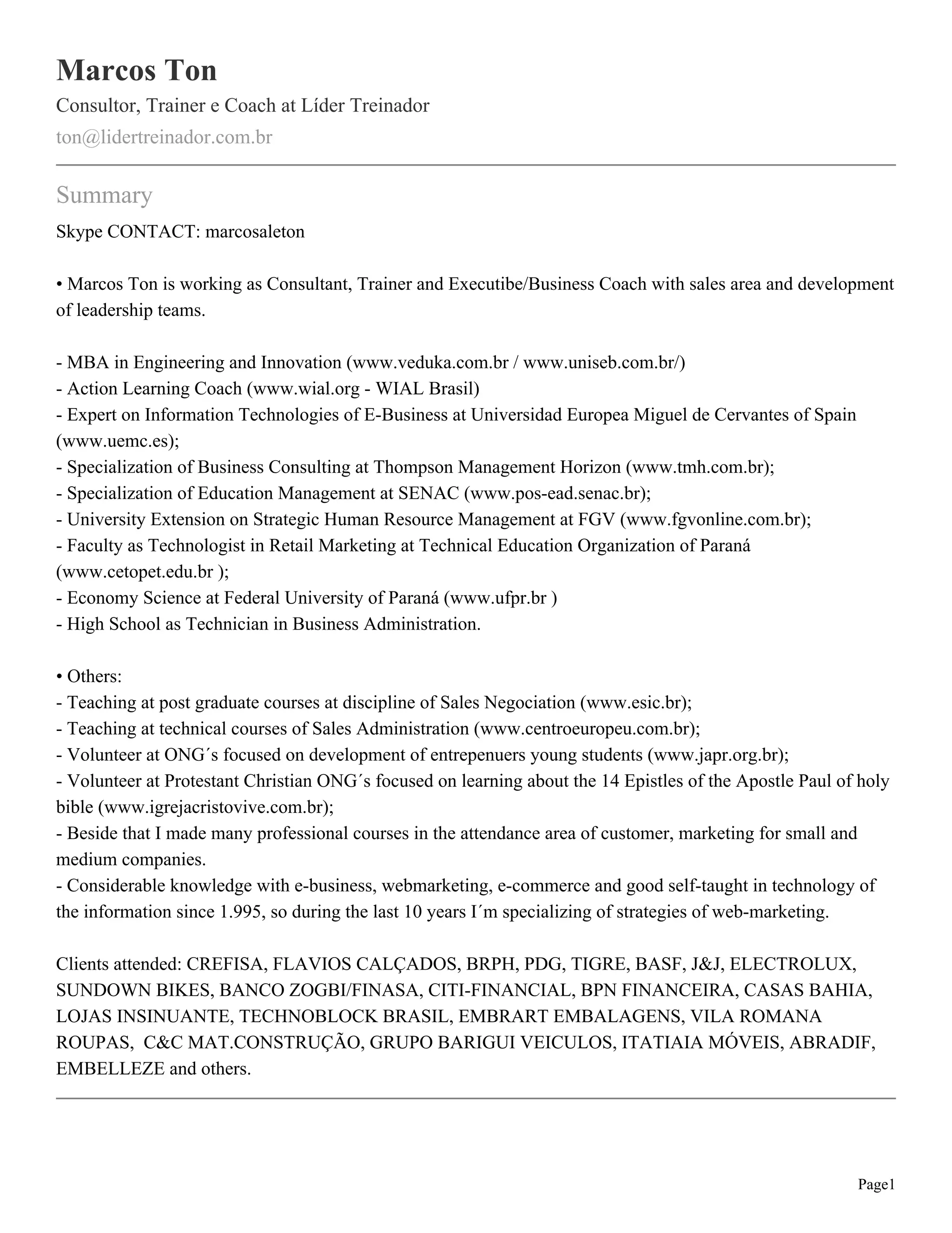 Marcos Ton trabalha como consultor, treinador e coach executivo/empresarial com foco em vendas e