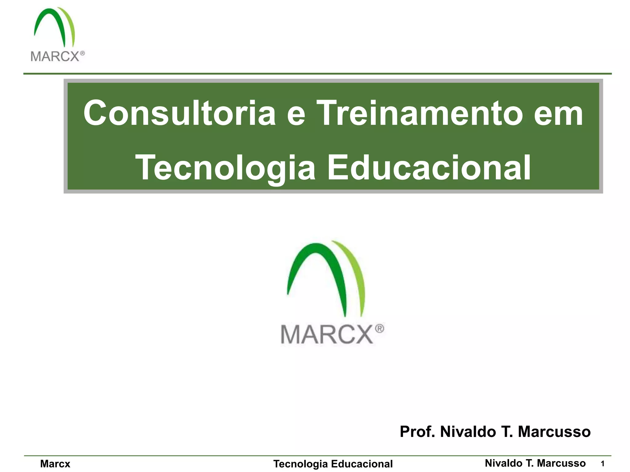 Este documento apresenta os serviços de consultoria e treinamento em tecnologia educacional oferecidos por Nivaldo T. Marcusso, professor e consultor com mais de 25 anos de experiência na área. Os serviços incluem o desenvolvimento de arquiteturas de tecnologia educacional, implantação de plataformas de e-learning e treinamento, além de consultoria para universidades corporativas virtuais.