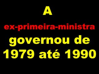 Margaret Thatcher foi a primeira-ministra do Reino Unido de 1979 a 1990, conhecida por seu discurso anticomunista e liberalização econômica. Ela enfrentou a guerra contra a Argentina pelas Ilhas Malvinas e embates com sindicatos, ganhando o apelido de "Dama de Ferro". Sua atuação contra a URSS e em apoio a Reagan ajudou no fim da Guerra Fria.
