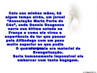 O documento relata a história de Dennis Dougnene que conseguiu embarcar com material de evangelização em excesso no aeroporto após pedir a ajuda de Nossa Senhora dizendo "MARIA PASSA NA FRENTE". O documento também convida o leitor a fazer uma novena para Nossa Senhora de Fátima rezando um Pai Nosso e três Ave Marias por nove dias.