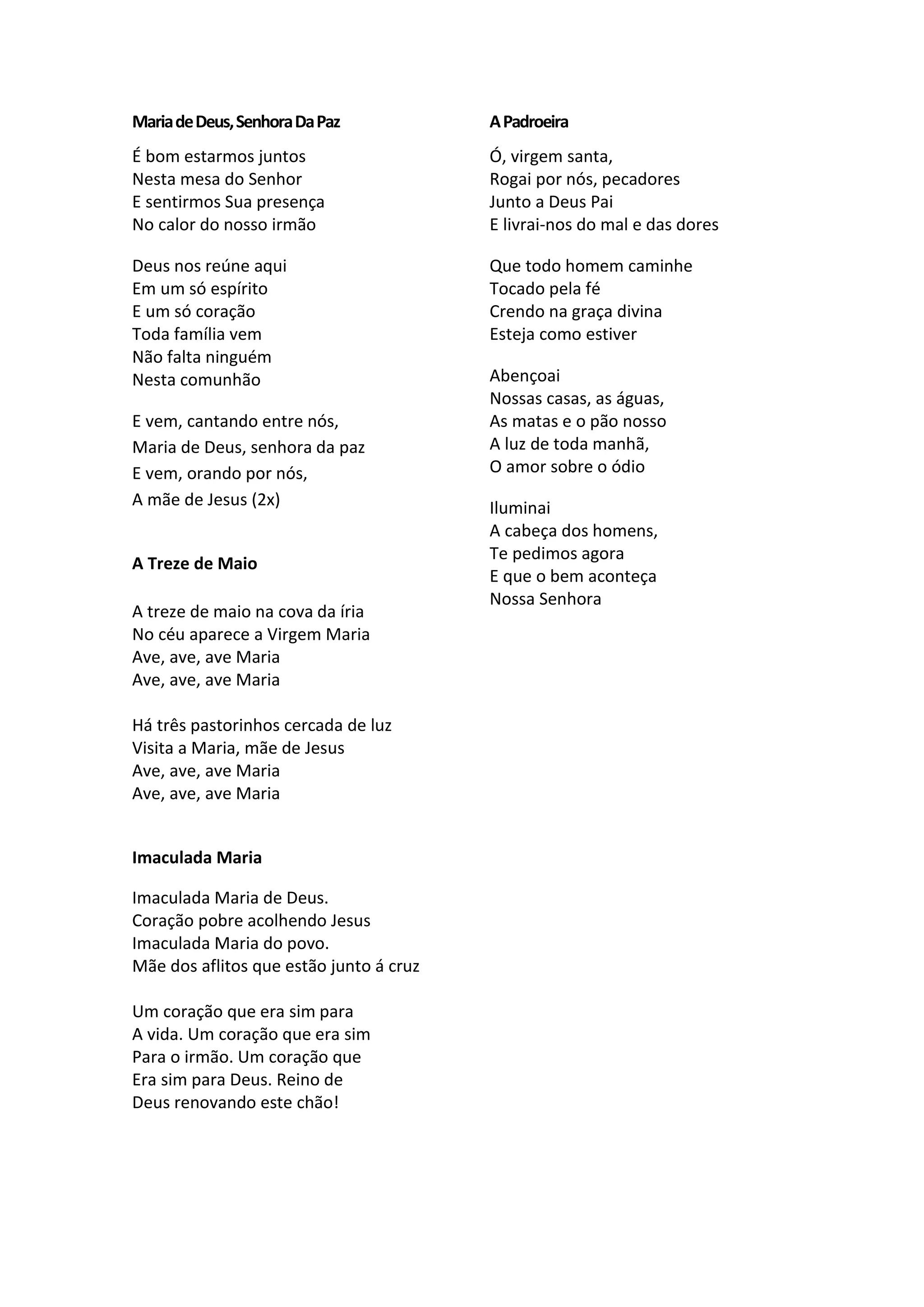 O documento é uma coleção de canções católicas dedicadas a Nossa Senhora, celebrando sua presença, sua aparição em Fátima, e pedindo sua intercessão junto a Deus em nome da humanidade.