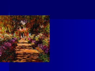 Claude Monet nasceu em 1840 em Paris e demonstrou talento para a arte desde cedo. Ele ajudou a fundar o movimento impressionista ao pintar paisagens ao ar livre e capturar os efeitos da luz. Monet passou por dificuldades financeiras em sua carreira, mas encontrou sucesso com exposições impressionistas e ao se mudar para Giverny, onde pintou séries famosas.
