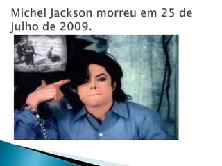 Michael Jackson nasceu em 1958 e se tornou o rei do pop, ganhando fama mundial com músicas como "Billie Jean", "Thriller" e "Beat It". Ele recebeu uma estatua em sua homenagem e vendeu milhões de discos, se tornando um dos maiores artistas de todos os tempos. Infelizmente, Michael acabou falecendo prematuramente devido ao uso excessivo de remédios prescritos e problemas cardíacos.