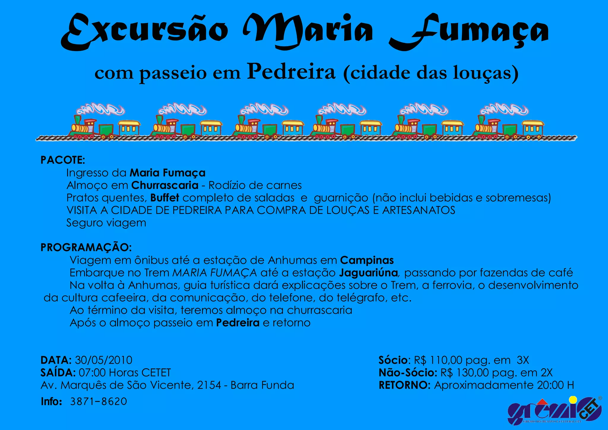 O pacote inclui passeio de trem Maria Fumaça entre Anhumas e Jaguariúna, almoço em churrascaria, e visita à cidade de Pedreira para comprar louças e artesanatos. O passeio ocorrerá em 30 de maio com saída às 7h e retorno por volta das 20h, saindo de São Paulo.