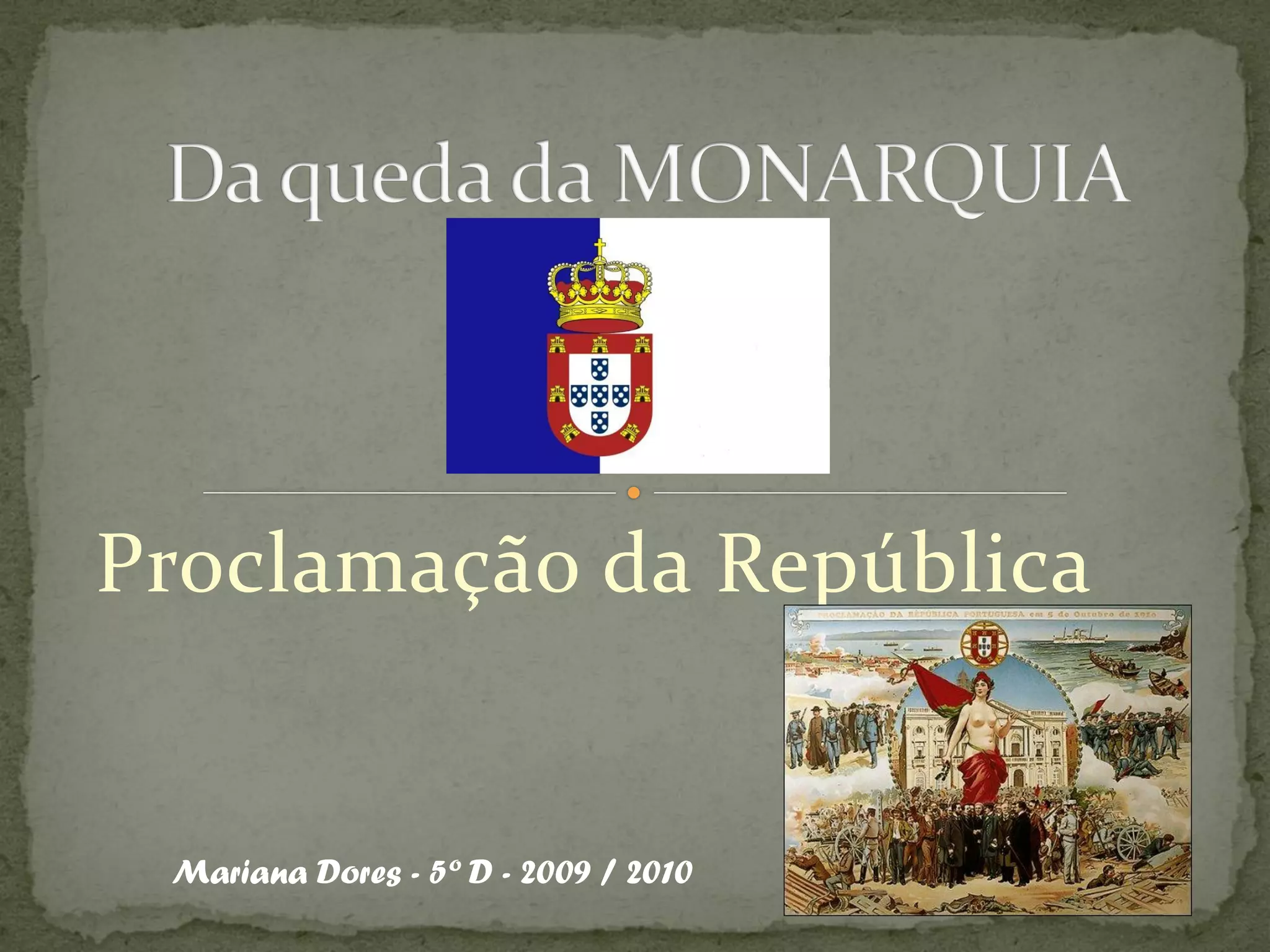 O documento descreve a queda da monarquia e a implantação da República em Portugal em 1910. Detalha os problemas políticos e econômicos que levaram à revolução republicana, incluindo instabilidade política, agitação social e participação na Primeira Guerra Mundial. Também resume as principais medidas tomadas pelos republicanos após a proclamação da República, como a nova constituição, educação obrigatória e reconhecimento de sindicatos. No entanto, a instabilidade política continuou e a participação na guerra piorou a situação