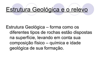 O documento descreve as principais estruturas geológicas do Brasil, incluindo escudos cristalinos antigos como o Quadrilátero Ferrífero e Carajás, bacias sedimentares como as da Amazônia e Pantanal, e derrames vulcânicos como na Bacia do Paraná. Essas estruturas geológicas contêm recursos minerais importantes como ferro, alumínio, carvão e petróleo.