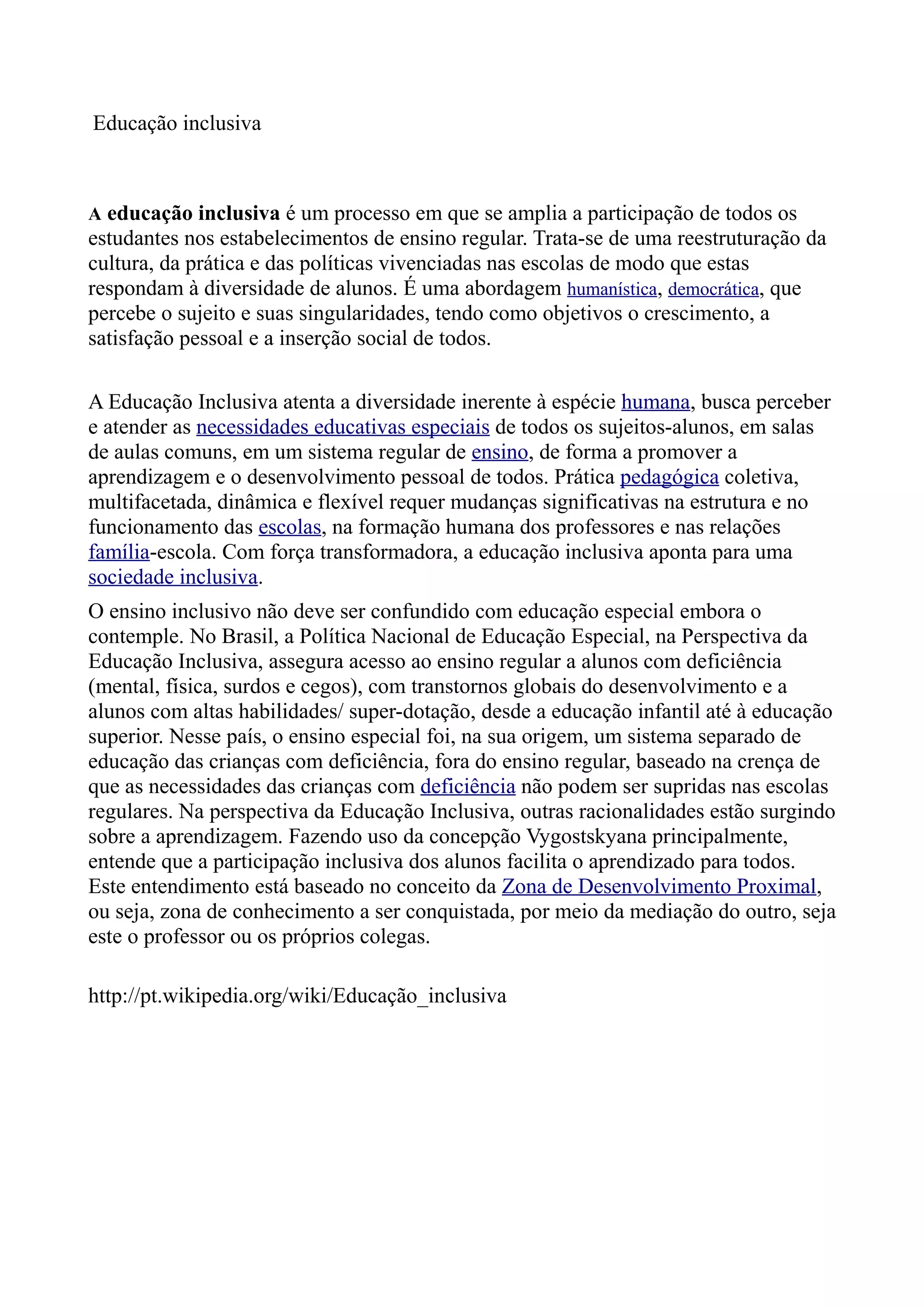 A educação inclusiva promove a participação de todos os estudantes nas escolas regulares através de uma abordagem humanística e democrática que atende às necessidades individuais de cada aluno. Ela requer mudanças significativas na estrutura e funcionamento das escolas para apoiar a diversidade de alunos e promover o aprendizado de todos. A educação inclusiva defende a inclusão de alunos com deficiência ou necessidades especiais nas salas de aula regulares.
