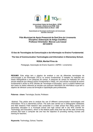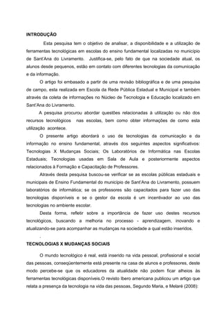 Este documento resume um artigo científico sobre o uso de tecnologias da comunicação e informação no ensino fundamental. O artigo analisa a disponibilidade e uso de ferramentas tecnológicas em escolas públicas estaduais e municipais de Sant'Ana do Livramento através de pesquisa bibliográfica e de campo. Conclui que as escolas possuem laboratórios de informática, mas que os professores precisam de mais capacitação para fazer uso das tecnologias disponíveis em suas aulas.