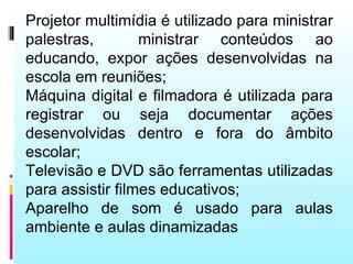 O documento descreve as tecnologias usadas no centro de ensino médio Oquerlina Torres, incluindo textos impressos e digitais, apresentações multimídias, páginas da web e imagens para ensinar estudantes. Ele também menciona o uso de projetores, máquinas digitais, televisão e aparelhos de som para facilitar a aprendizagem.