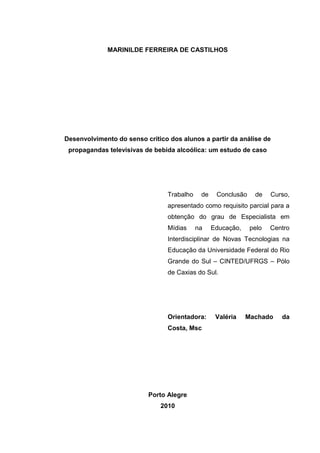 Este estudo propõe uma atividade didática para desenvolver o senso crítico de alunos do 8o ano sobre propagandas de bebidas alcoólicas na TV. A atividade analisa recursos linguísticos e outros aspectos persuasivos das propagandas. Questionários e testes são aplicados antes e depois da atividade para verificar se houve melhora na criticidade dos alunos. Os resultados sugerem que a intervenção educativa melhorou a capacidade crítica dos alunos sobre as intenções e mensagens das propagandas.