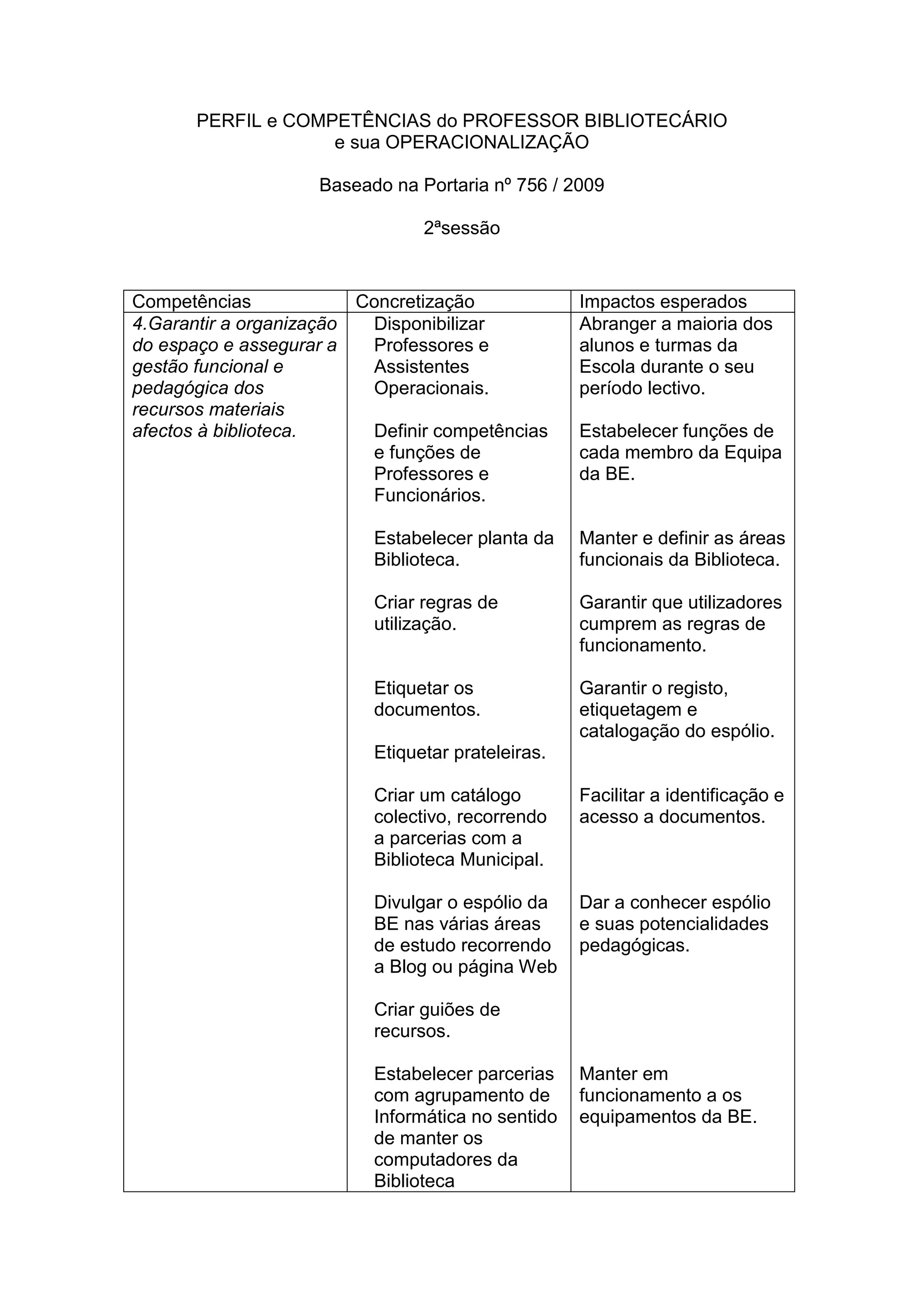 Este documento discute as competências e operacionalização de um bibliotecário escolar com base na Portaria no 756/2009. Ele destaca a importância de (1) organizar o espaço da biblioteca e gerir seus recursos materiais, (2) definir as funções dos professores e funcionários, e (3) estabelecer uma política de aquisição equilibrada para integrar os recursos de informação nas práticas pedagógicas.