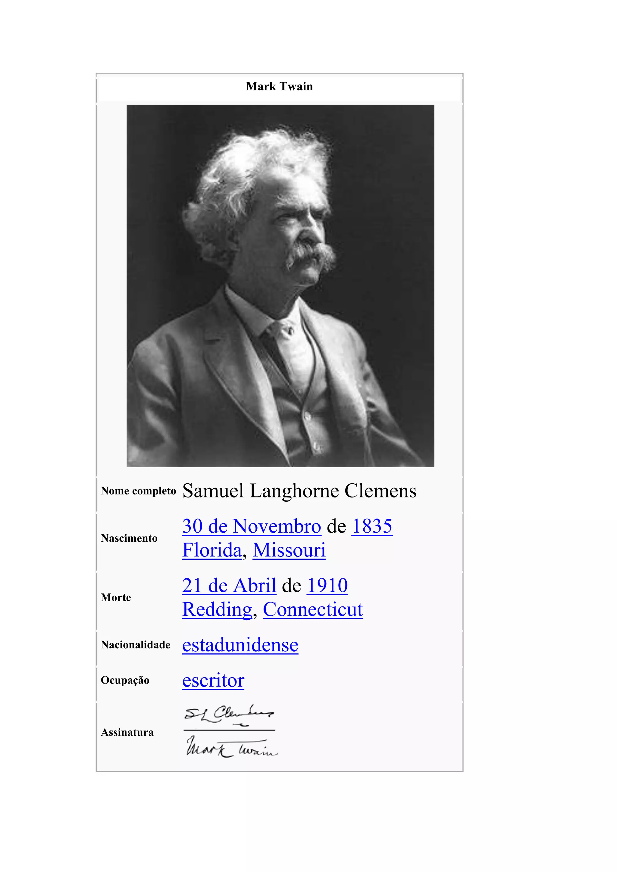 1) Mark Twain foi um escritor estadunidense nascido em 1830 na cidade de Florida, Missouri.