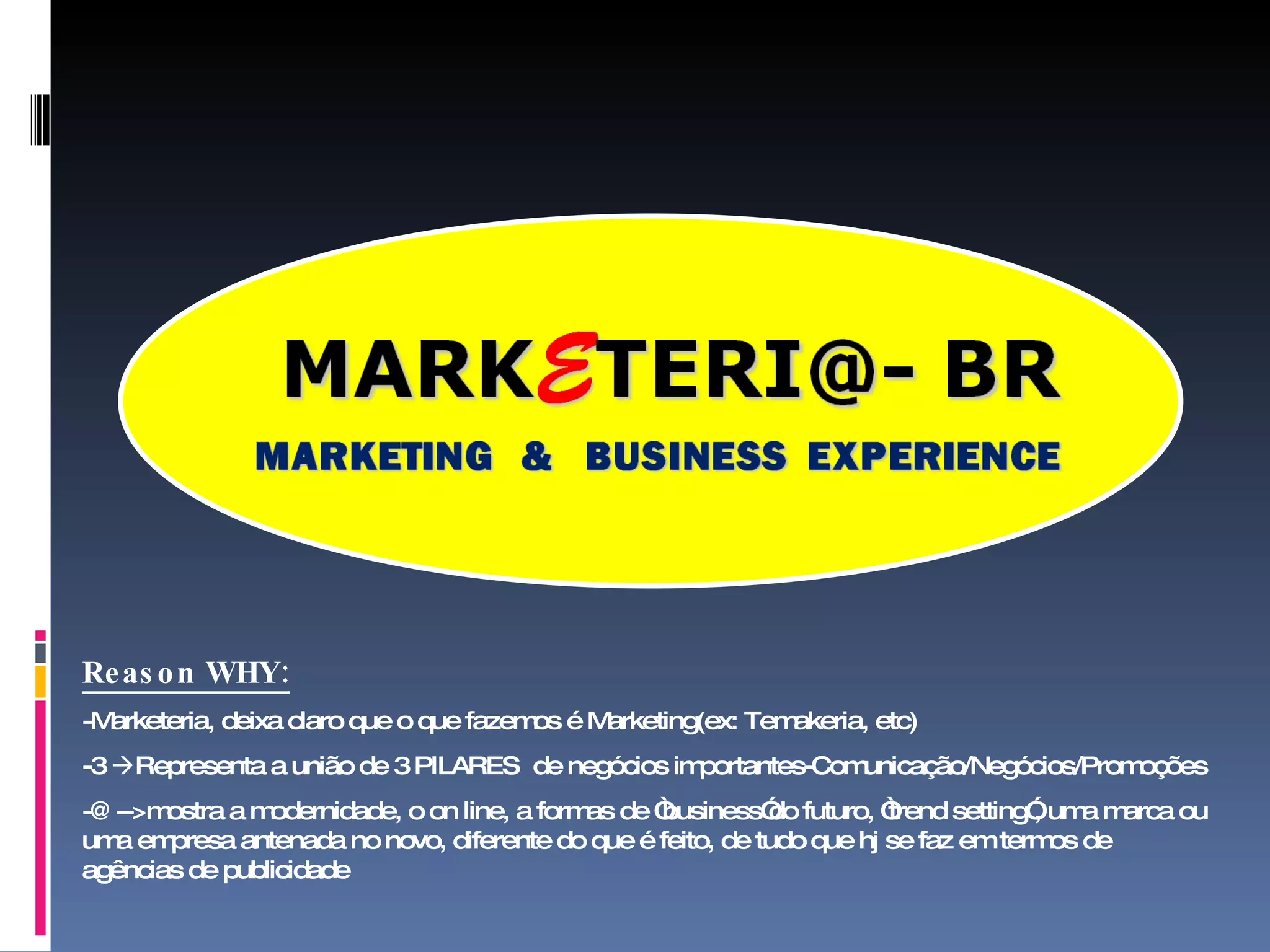 A agência Marketeria foi criada para preencher uma lacuna no mercado de agências focadas em criar valor para os clientes ao invés de focar nas próprias faturas. A agência oferece serviços integrados de marketing e negócios para ajudar clientes a construírem histórias de sucesso através de planejamento estratégico, execução de ações e acompanhamento de resultados. A experiência dos sócios em grandes empresas os capacita a transferirem conhecimento para a coordenação das estratégias de negócios