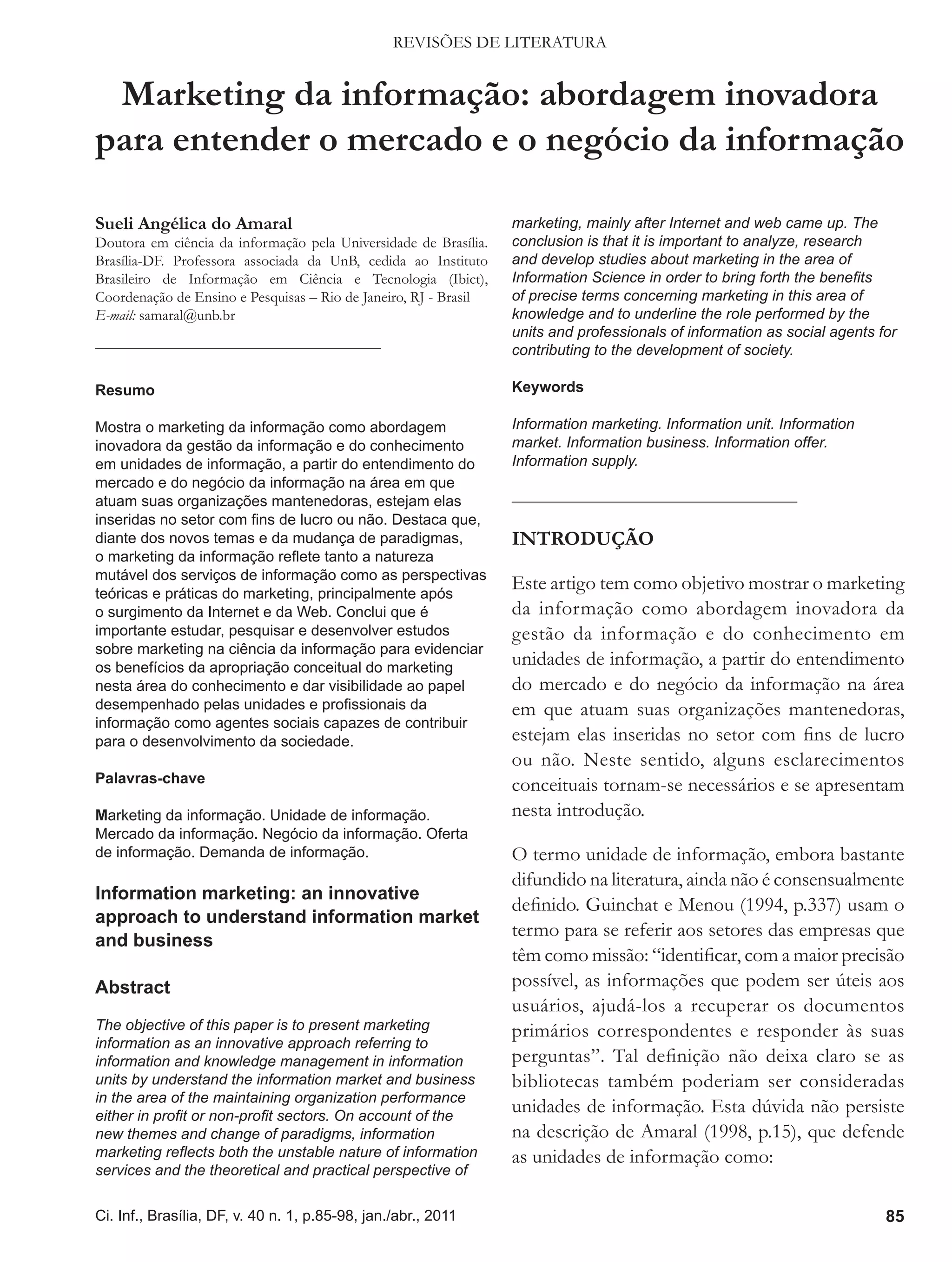 Este documento discute o marketing da informação como uma abordagem inovadora para a gestão da informação e do conhecimento em unidades de informação. Apresenta os desafios impostos pela evolução da sociedade para essas unidades e destaca a importância de entender o mercado e o negócio da informação para atender as necessidades dos usuários de forma personalizada.