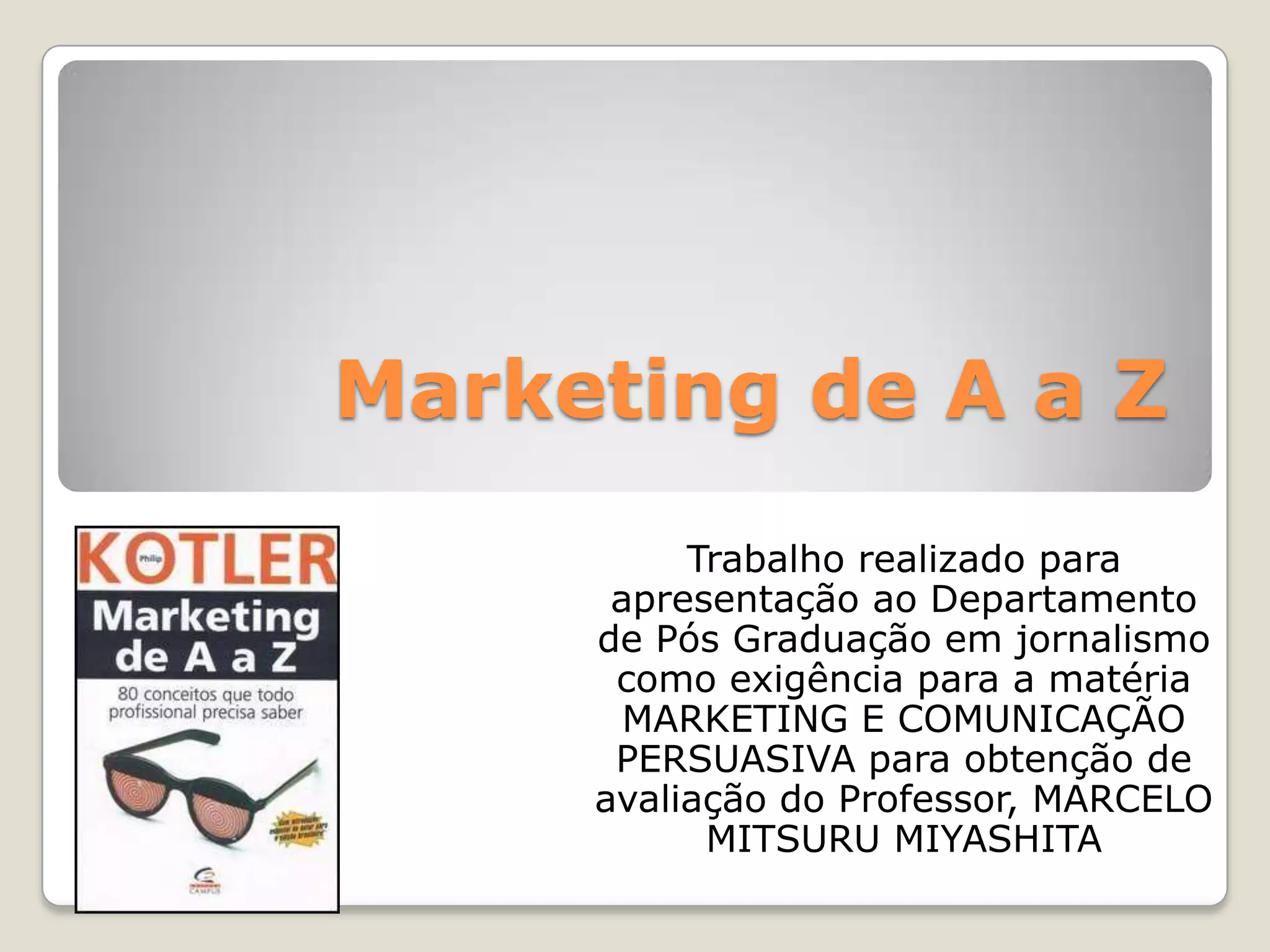 O documento resume os principais pontos do livro "Marketing de A a Z" escrito por Philip Kotler. O livro define 80 conceitos fundamentais de marketing de forma concisa e alfabética. Também discute tópicos como clientes, comunicação, produto, estratégia e liderança, enfatizando a importância de entender as necessidades dos clientes e construir relacionamentos de longo prazo.