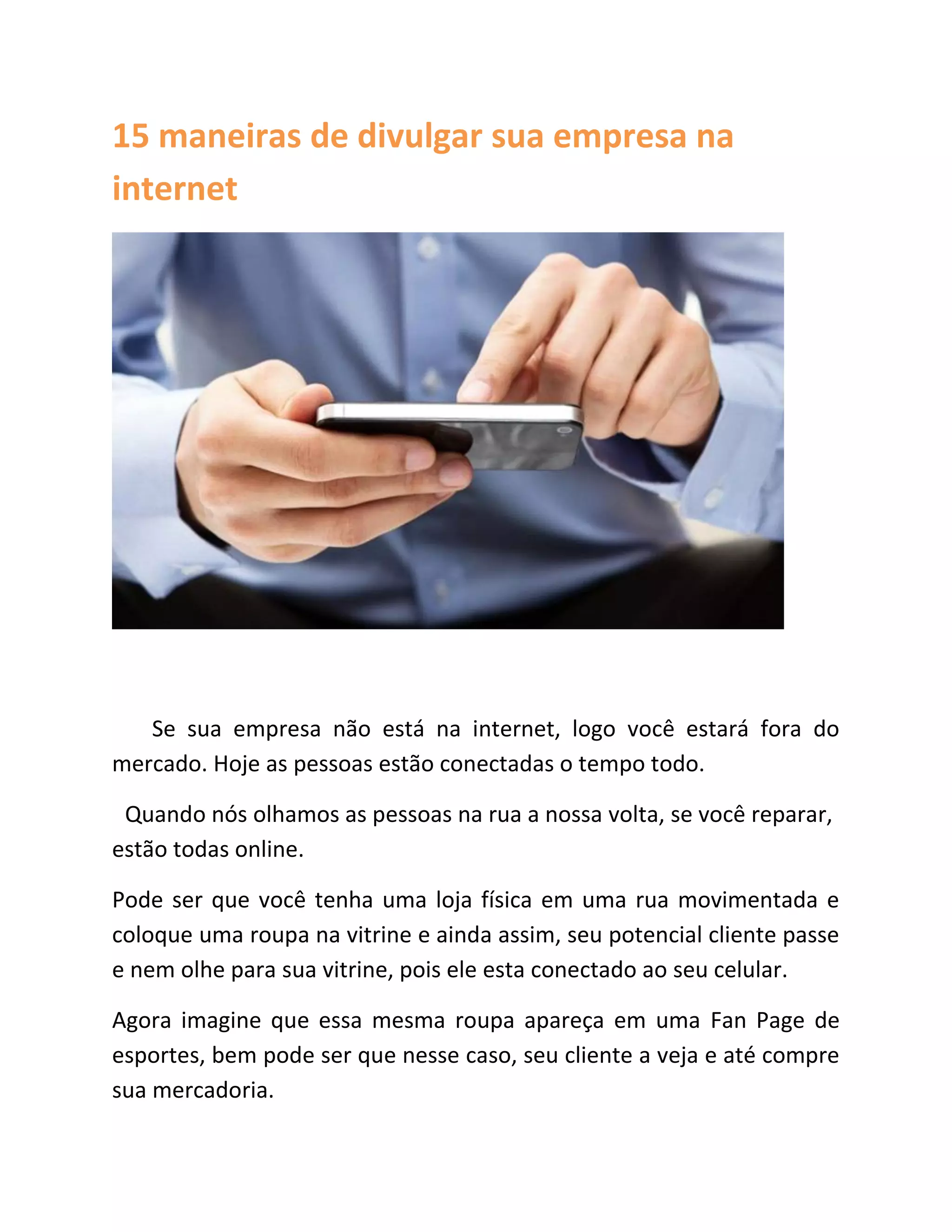 O documento fornece 15 maneiras de divulgar uma empresa na internet através do marketing de conteúdo, enfatizando a importância de publicar regularmente conteúdo relevante e significativo para o público-alvo, diversificar esforços em várias plataformas de mídia social, e interagir com influenciadores e a comunidade online para aumentar o engajamento.