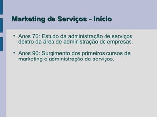 O documento discute a evolução e elementos do marketing de serviços. Apresenta como o marketing de serviços surgiu na década de 1970 e ganhou importância na década de 1990. Também destaca as influências no marketing de serviços como mudanças regulatórias, privatizações, inovações tecnológicas e a internacionalização. Finalmente, descreve os oito elementos do marketing integrado de serviços.