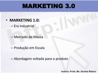 O documento descreve os três estágios de marketing (Marketing 1.0, 2.0 e 3.0) e as características do Marketing 3.0, incluindo o marketing colaborativo, cultural e a ascensão da sociedade criativa. Ele também fornece dados demográficos de usuários da rede social Boo-Box.
