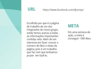 O documento fornece métricas de desempenho de uma página no Facebook entre 7-13 de outubro, incluindo curtidas, visualizações, alcance e envolvimento. Ele também discute lições aprendidas sobre a importância do planejamento prévio e revisão da estratégia ao longo do caminho.