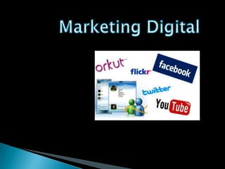 O documento discute o que é marketing digital, sua importância para as empresas e algumas ferramentas digitais como blogs, redes sociais (Facebook, Twitter), vídeos no YouTube que podem ser usadas como parte de uma estratégia de marketing digital.