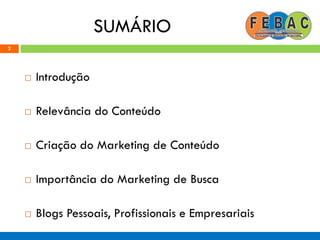 O documento discute o marketing de conteúdo e sua importância para o sucesso digital de empresas. Explica que o conteúdo relevante é essencial para os consumidores e ferramentas de busca, e que blogs pessoais, profissionais e empresariais podem ser usados para gerar e distribuir esse conteúdo.