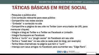 O documento fornece dicas sobre marketing digital para e-commerce, abordando tópicos como pesquisa de palavras-chave, tráfego, conversão e relacionamento com clientes. Também discute planejamento estratégico, perfis de usuários, conteúdo relevante, metodologias de trabalho, promoção de sites, táticas de link building e SEO, e métricas para medir resultados.
