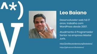 Leo Baiano é um desenvolvedor web com 17 anos de experiência e especialista em WordPress desde 2007. Sua palestra aborda como usar a ferramenta Google Tag Manager para implementar tags de forma dinâmica e gerenciar eventos do usuário, melhorando o marketing e a programação de sites WordPress. O GTM permite inserir tags de forma flexível através de uma interface sem necessidade de código, facilitando a manutenção e debug de tags.