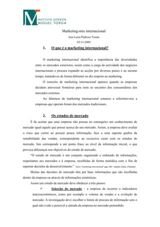 O documento discute o marketing internacional e o marketing-mix. Primeiramente, define marketing internacional como identificando as diferenças entre mercados externos e expandindo as ações para diversos países de forma diferenciada. Também discute a importância de estudos de mercado para entender as necessidades locais e segmentar o mercado-alvo. Finalmente, define produto como um conjunto de atributos tangíveis e intangíveis que satisfazem o comprador.