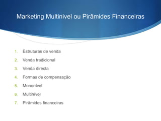 O documento discute as diferenças entre marketing multinível, vendas diretas e pirâmides financeiras. Marketing multinível permite que vendedores ganhem comissões das vendas de outros vendedores abaixo deles na estrutura, ao contrário de vendas diretas mononível. Pirâmides financeiras prometem lucros apenas com a entrada de novos membros, sem venda real de produtos, tornando-as esquemas insustentáveis e ilegais.
