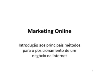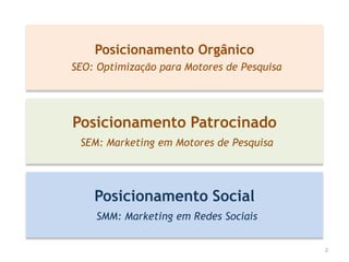 O documento discute três métodos principais de posicionamento de negócios online: posicionamento orgânico (SEO), posicionamento patrocinado (SEM) e posicionamento social (SMM). SEO refere-se à otimização de sites para motores de busca, SEM ao marketing em motores de busca e SMM ao marketing em redes sociais.