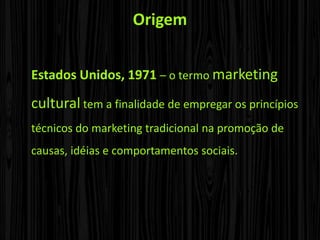 O documento discute o marketing social, definido como o uso de técnicas de marketing para promover mudanças sociais e comportamentais. Ele traz as origens do termo nos EUA em 1971, definições de marketing social, agentes envolvidos, a diferença entre marketing social e marketing relacionado a causas, e o McDia Feliz como exemplo de campanha de marketing social no Brasil.