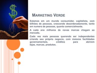 O documento discute o marketing verde e sustentável. Ele descreve como as empresas estão usando campanhas de marketing ecológicas que utilizam elementos naturais como areia, neve e jatos de água para divulgar marcas de forma criativa e com menor custo ambiental. Além disso, as propagandas geram um retorno substancial de investimento para a empresa. O documento também discute a importância de se respeitar a natureza e desenvolver sustentavelmente para as futuras gerações.