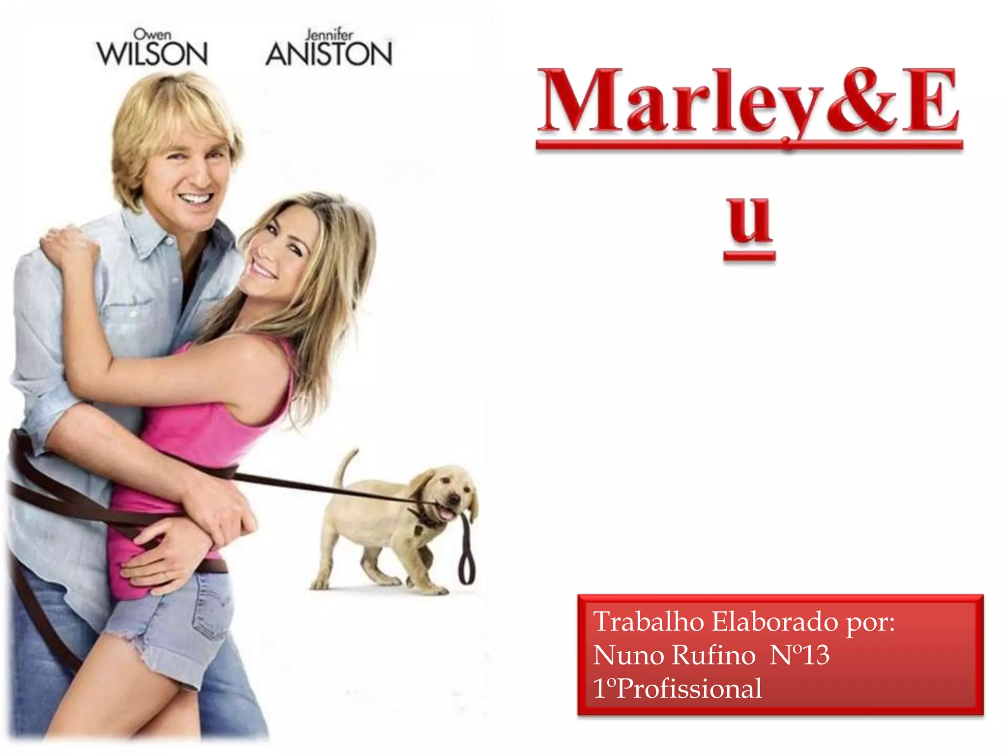 Este documento resume o livro "Marley & Eu" de John Grogan. Narra a história de um casal que adota um cão labrador mal comportado chamado Marley, que os acompanha em vários momentos da vida, incluindo o nascimento de seus três filhos. No final, Marley fica doente e morre, sendo enterrado com honras no jardim de casa.